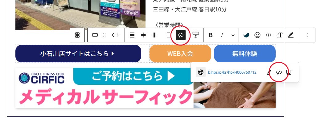 ②先に入っているリンクを削除します、画像の赤丸の部分をクリックして削除します